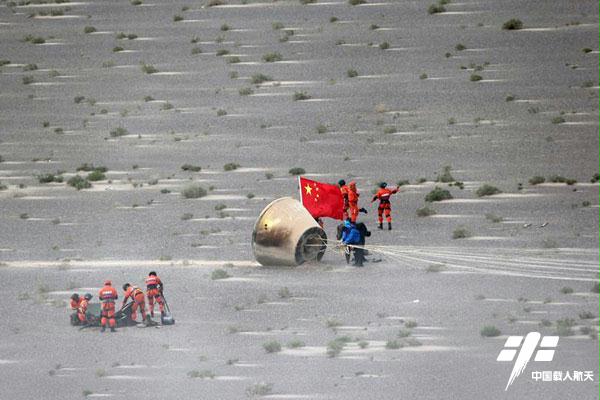 图:长征七号搭载的多用途飞船缩比返回舱安全着陆