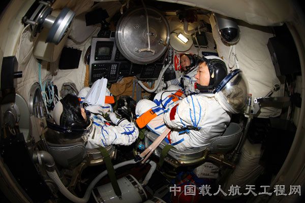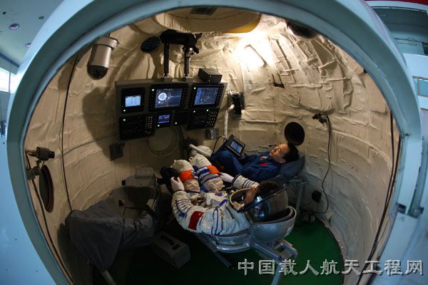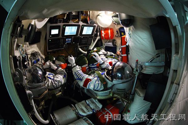 图1:执行神舟九号航天飞行任务的航天员乘组景海鹏、刘旺、刘洋在返回舱进行手控交会对接训练。(秦宪安 摄)