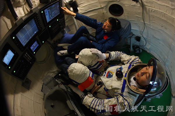图5:航天员景海鹏、刘旺在返回舱进行手控交会对接训练。(秦宪安 摄)