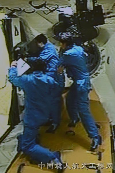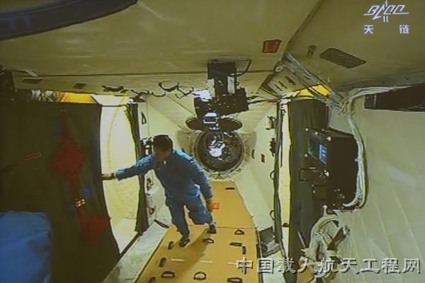 图:6月18日17时07分,景海鹏第一个从神舟九号穿舱进入天宫一号(秦宪安 摄)