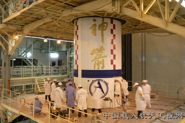 2005年9月17日,在垂直总装测试厂房,发射测试站火箭操作人员对火箭进行综合测试检查