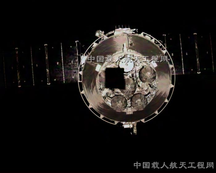图:伴星开启后宽视场相机获取的第一张图片拍摄时间为航天员按下释放按钮后6秒钟,伴星位于飞船前方4米处