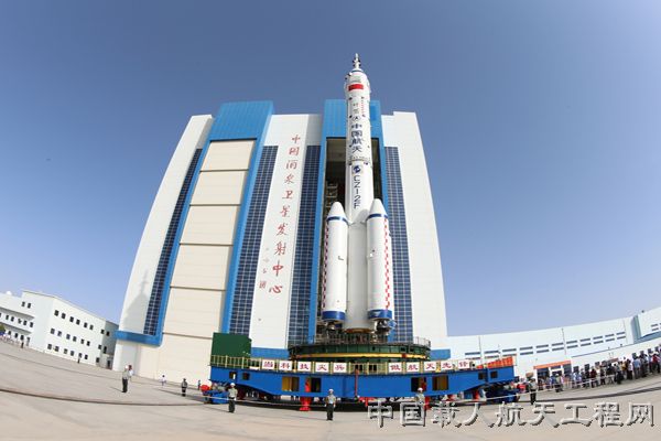 神舟十号船箭组合体从垂直组装厂房运出,露出真容 (秦宪安 摄)