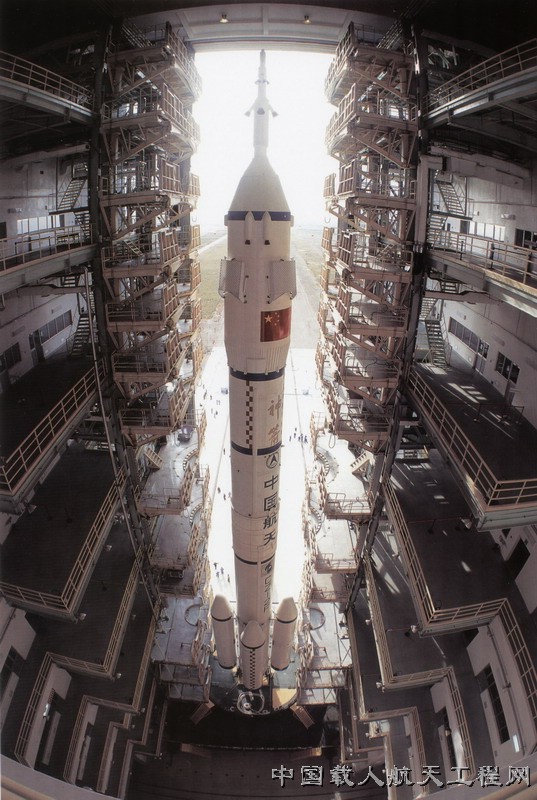 长征-2f火箭载着神舟五号飞船从垂直测试厂房整体转运发射场