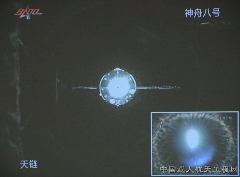 图1:北京飞控大厅内显示的,神舟八号正在进行最后靠拢,图为神舟八号拍摄的天宫一号。(彭帅 摄)