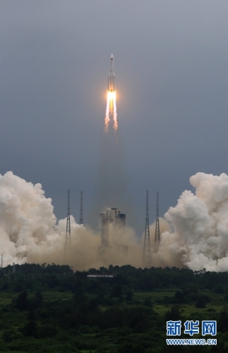 ↑搭载着中国空间站天和核心舱的长征五号B遥二运载火箭,在我国文昌航天发射场点火升空。新华社记者琚振华 摄