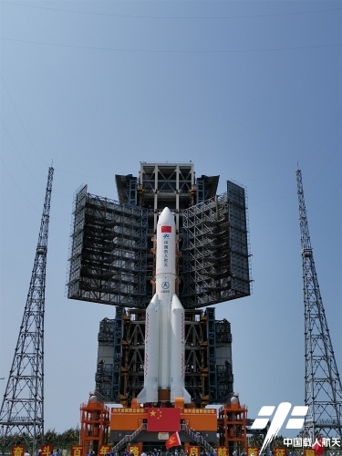 搭载空间站核心舱的长征五号B运载火箭转运至发射塔架