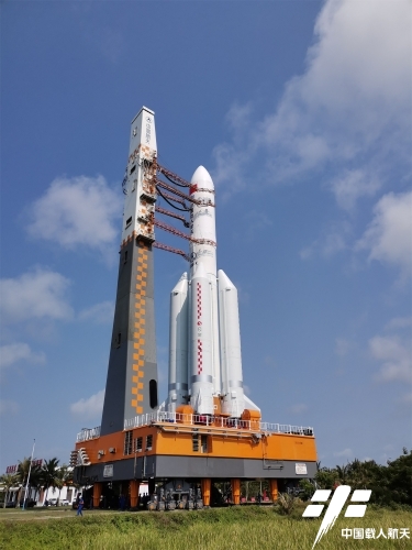 搭载空间站核心舱的长征五号B运载火箭转运至发射塔架