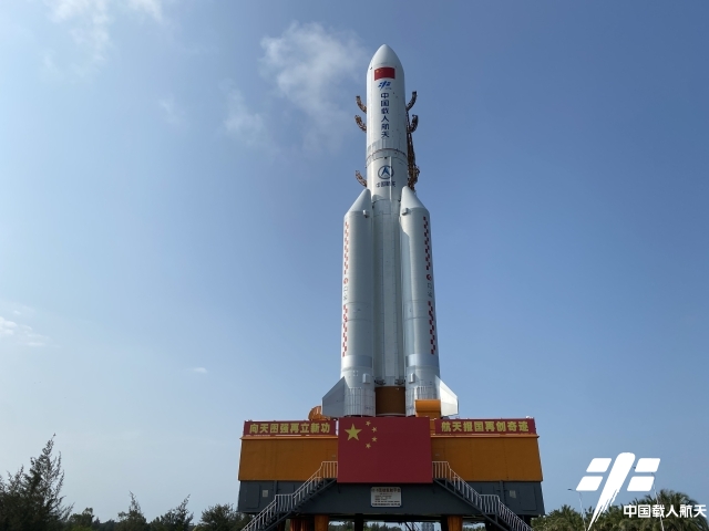 搭载空间站核心舱的长征五号B运载火箭转运至发射塔架