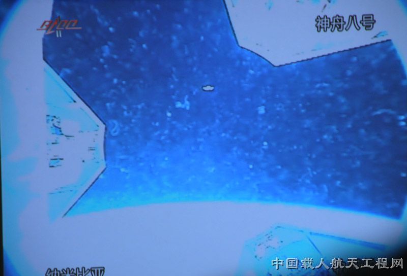 图:北京飞控大厅内显示的,神舟八号飞船摄像头拍摄的天宫一号目标飞行器图像(图片中上部两点处)。(彭帅 摄)