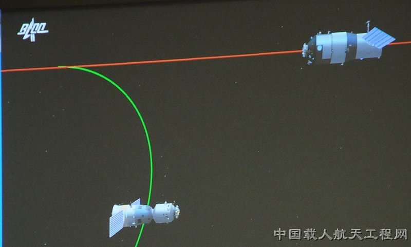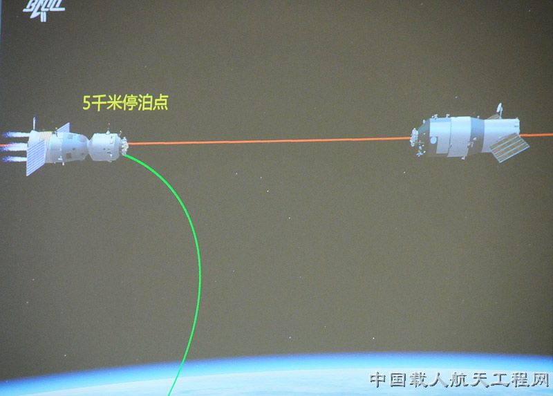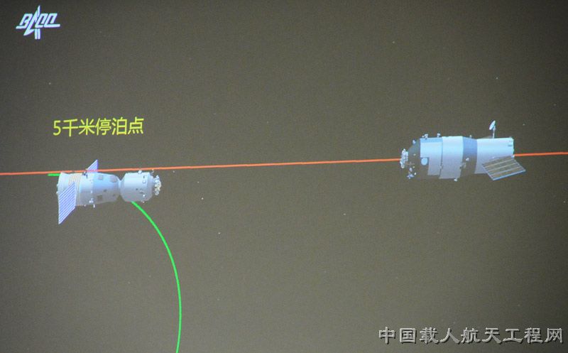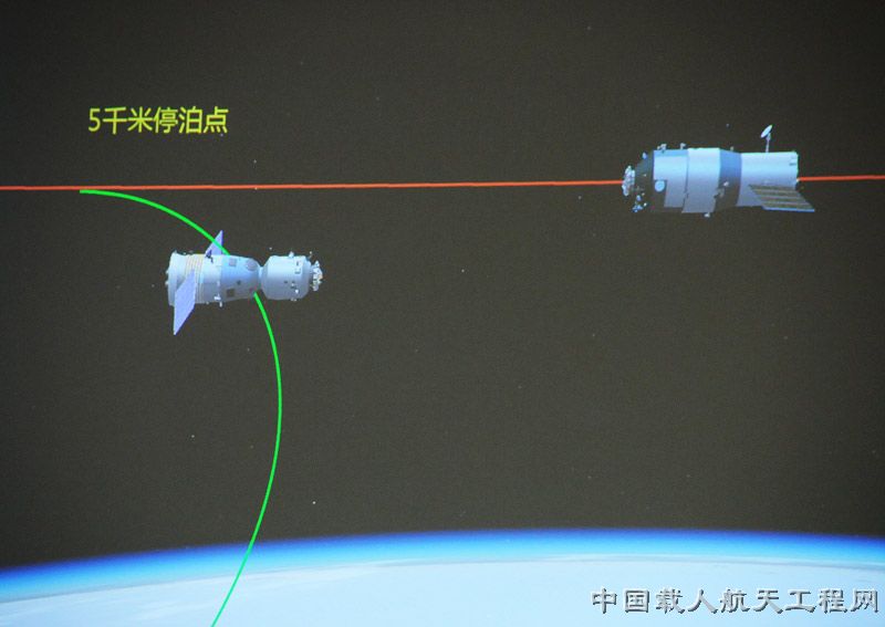 图2:神舟八号飞船经过五次变轨后的状态,于11月3日0时04分成功到达相距天宫一号5千米的停泊点。(彭帅 摄)