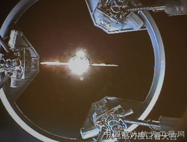 图:2011年11月14日,天宫一号/神舟八号成功分离后进行二次对接。图为神八轨道舱拍摄的天宫一号视频截屏。(宫继良 摄)