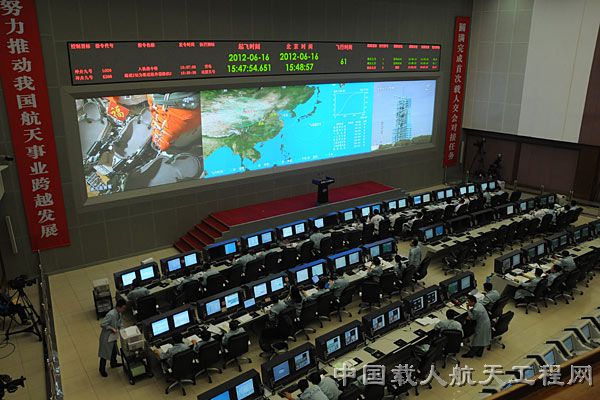 图1:2012年6月16日,北京航天飞行控制中心指挥大厅关注着神舟九号发射前的准备工作。(徐阳 摄)