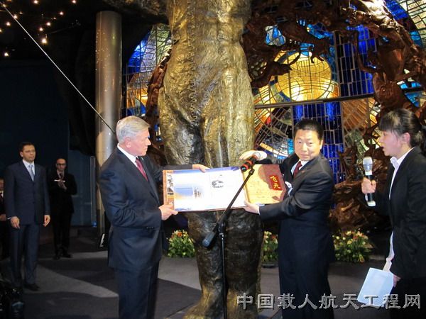图2:杨利伟向波米诺夫局长赠送神舟七号飞船搭载的纪念邮册
