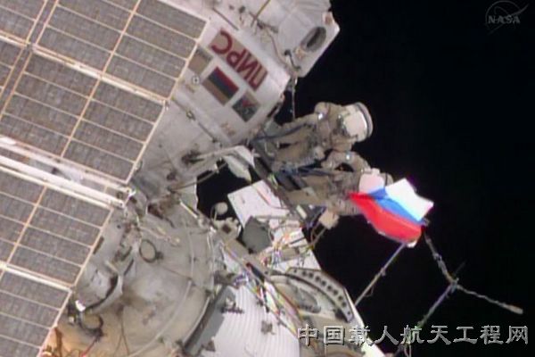 图:俄航天员完成出舱活动后打开俄罗斯国旗以纪念俄罗斯国旗日 (图片来源:NASA网站)