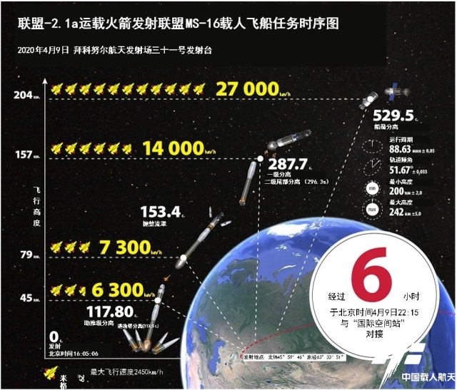 莫斯科时间2020年4月9日11:05(北京时间4月9日16:05),俄罗斯从拜科努尔航天发射场三十一号发射台利用联盟-2.1a运载火箭成功将联盟MS-16载人飞船发射进入预定轨道。飞船搭载3名航天员,经过约6个小时飞行,成功与“国际空间站”对接。