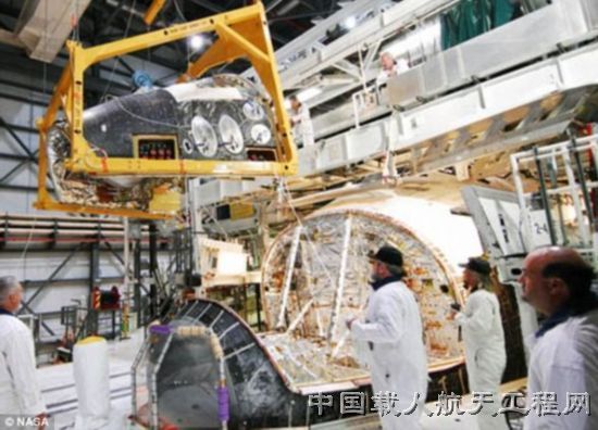 图:肯尼迪航天中心的工作人员正在拆卸“发现”号的前反作用力控制系统。