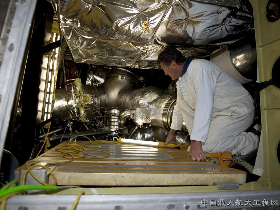 图:一名技术人员正在检查“奋进”号航天飞机内部装置