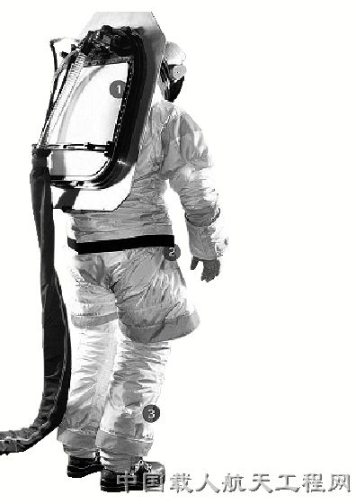 图中标号1:航天员通过背后的“舱口”进入舱外航天服内,这个“舱口”与载人飞船连在一起,这可以让航天员直接从太空舱进入航天服然后进行舱外活动