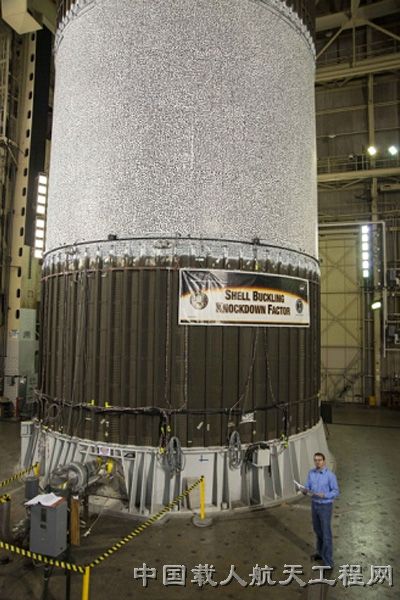 测试使用的铝锂燃料罐是由航天飞机的硬件改造而成,罐身上设有7万个黑白点,以便高速相机能够聚焦弯曲、断裂细节。(尉艳娟 编译)