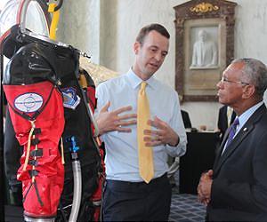 图:博尔登听取终极前沿设计公司代表介绍3G航天服样机(图片来源:澳大利亚每日航天网站)