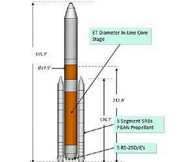 ATK公司的方案是使用五段式助推器,该五段式助推器主要参考在航天飞机上使用过的四段式固体火箭助推器,曾打算用于阿瑞斯1载人运载器的第一级。过去几年,NASA一直支持使用固体火箭助推器(SRB)作为阿瑞斯1和阿瑞斯5发射系统的捆绑式发动机,现在这两个发射系统已经被取消。由于有限的能源利用率和昂贵的飞行后翻新费用,许多专家曾反对这些应用装置使用固体火箭助推器。