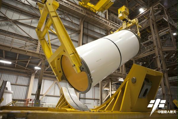 图:SLS火箭的一个助推器段测试版正在被吊起(图片来源:NASA网站)