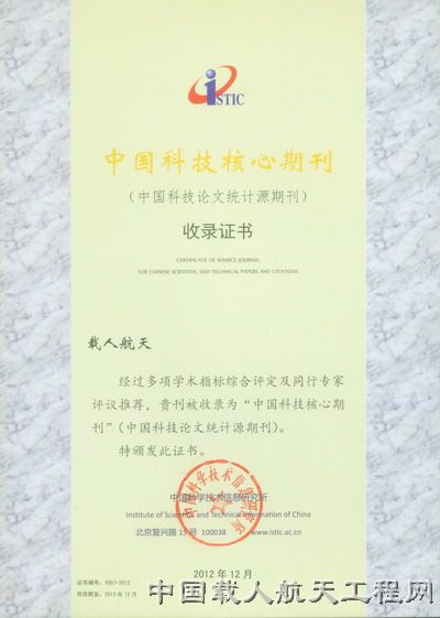 【中国载人航天工程网12月7日】2012年12月7日,中国科学技术信息研究所在京公布“2012年度中国科技论文统计结果”,《载人航天》等49种科技期刊新入选中国科技论文统计源期刊,进入中国科技核心期刊行列。