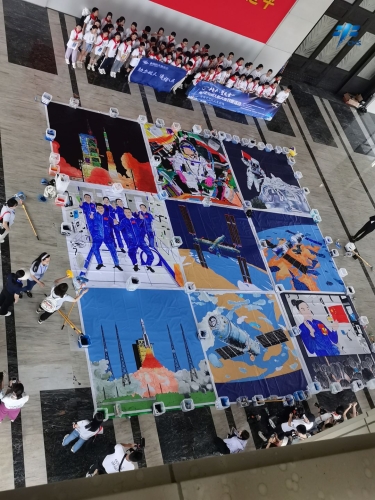 发射任务成功后,孩子们再次走进发射场,与科技人员以及各地来文昌研学的大小朋友们一起手拉手,共同在发射场里完成9幅大型绘画的涂色创作活动(每幅画边长3米多,9幅可拼成九宫格,面积约100平米)。这9幅画分别反映了神舟一号发射、神舟五号首次载人飞天、神舟七号首次出舱、神舟八号天宫一号首次交会对接、神舟十号首次太空授课、天舟一号首次货运飞船发射、长五B首飞、航天员乘组首次太空会师、空间站全面建成等9个载人航天工程30年来的标志性节点。通过百名青少年与航天人共绘航天画的形式,反映载人航天工程从一张白纸到成为现实的辉煌发展历程,加深了青少年对载人航天事业的认识,引导青少年增强志气、底气、骨气,播下热爱航天的种子。