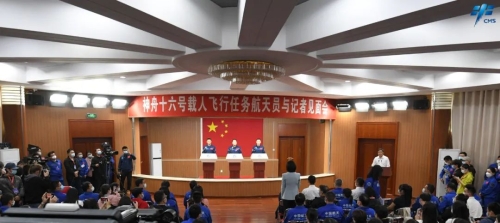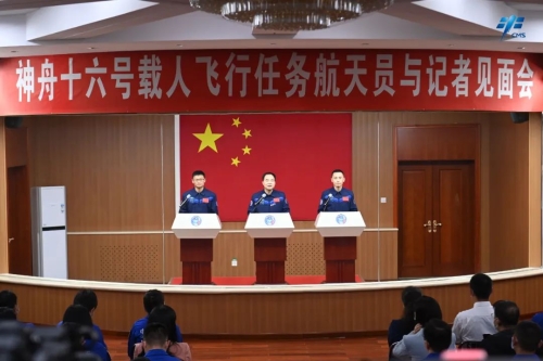 北京时间2023年5月29日11时,景海鹏、朱杨柱、桂海潮3名乘组航天员在酒泉卫星发射中心问天阁与中外媒体记者集体见面,并回答记者提问。这是神舟十六号飞行乘组的首次亮相。