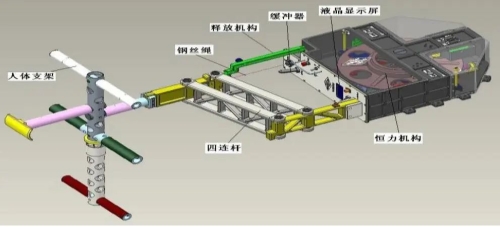 从外形来看,质量测量仪与大家平时使用的体重秤可以说是“毫不相关”,它主要由主机(恒力机构、测量系统)、四连杆、人体支架、释放机构和力传感器电缆等组成,属于航天员健康保障装备。