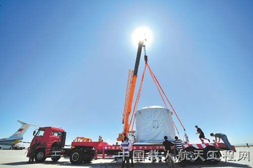 图:试验队队员正在机场小心翼翼地把神舟八号飞船轨道舱卸载到运输车上