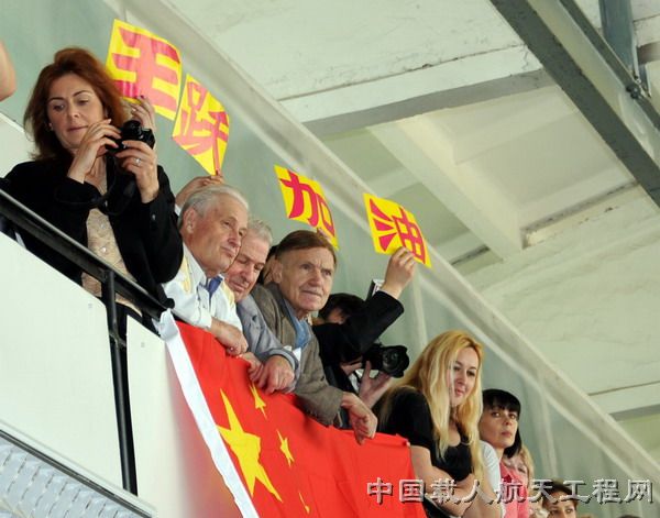 图:入舱仪式上的外国观众为王跃加油 (摄影:袁永刚)