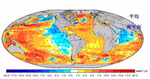 根据NASA/CNES合作的TOPEX/Poseidon卫星以及Jason-1卫星高度计在1993-2008年为期16年的观测结果,而获得的全球海平面升高情况(单位为mm)(由University of Colorado 提供)